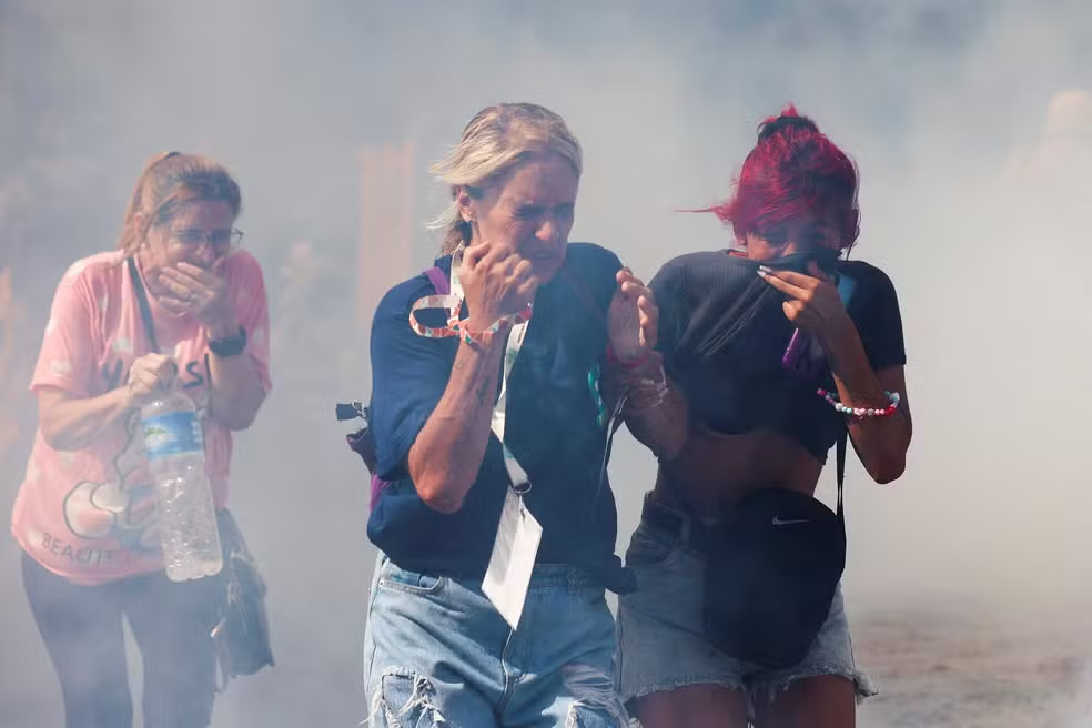 Mulheres correm em meio a gás lacrimogêneo durante um protesto em frente ao Senado argentino, em 11 de fevereiro de 2026 — Foto: REUTERS/Cristina Sille